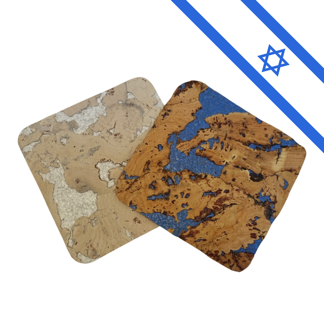 מארז תחתיות מרובעות משעם דקורטיבי בעבודת יד בגוונים של כחול ולבן - כי אין לנו ארץ אחרת.